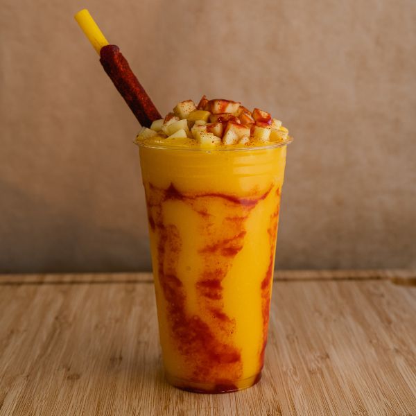 Mango smoothie with chamoy, spicy powder, Tajín, lime, and mango pieces